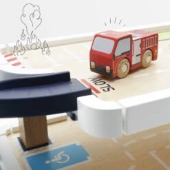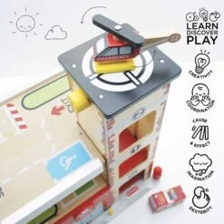Roll on to new adventures with this stunning George’s toy garage. Crafted from durable, FSC® – certified wood, this high quality toy features an exciting fire and rescue theme, complete with fire engine and helicopter. Built to withstand day after day of inspired play, little ones will be on standby ready for the next emergency as they discover the working bell, wind up car lift, wood composite ramps, opening and closing emergency door, heli-pad and parking bays. A wonderful toy to develop imaginations during realistic play sessions.