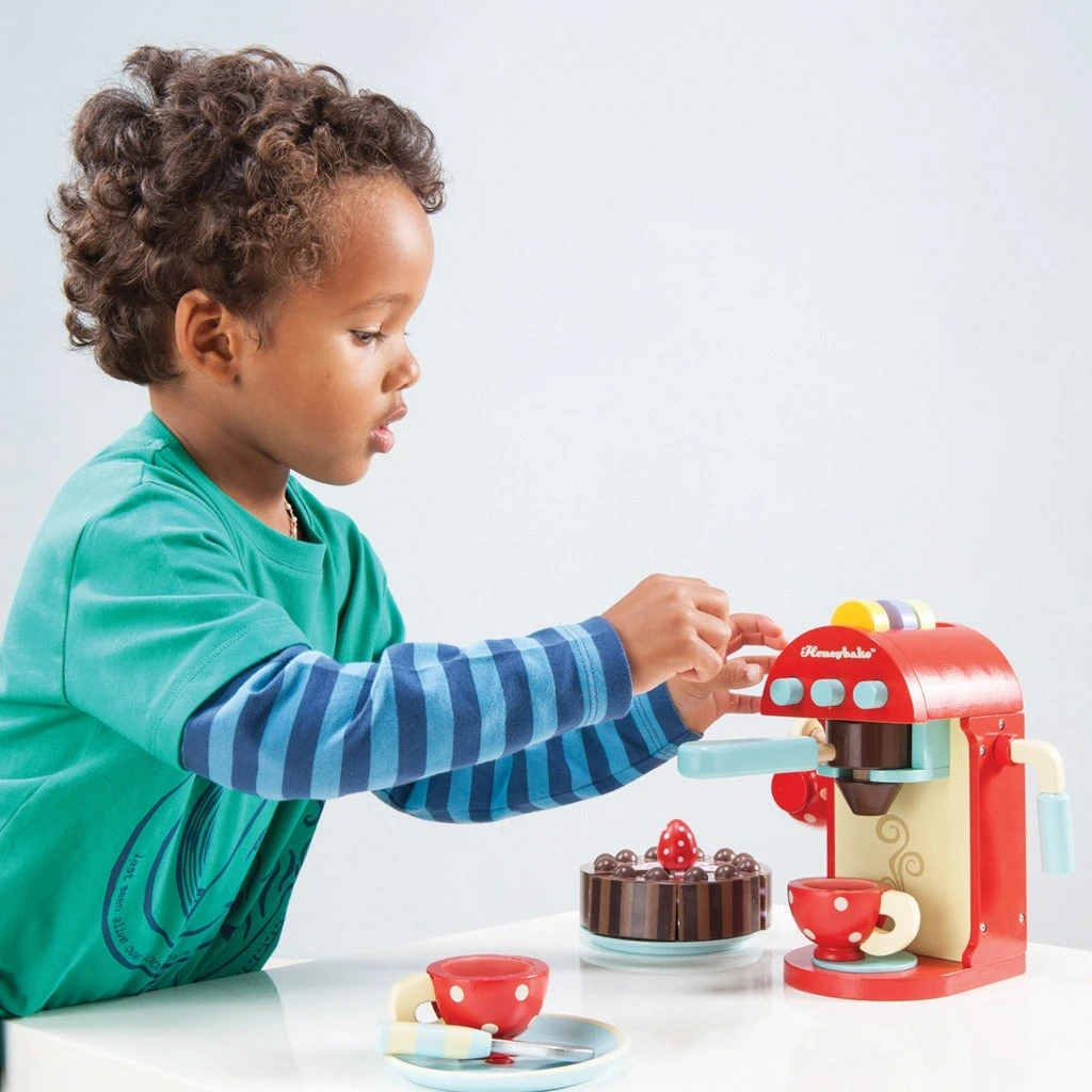 Includes colourful water based painted pods to insert in the removable filter, a ‘milk frother’, two water based painted cups and a spoon.