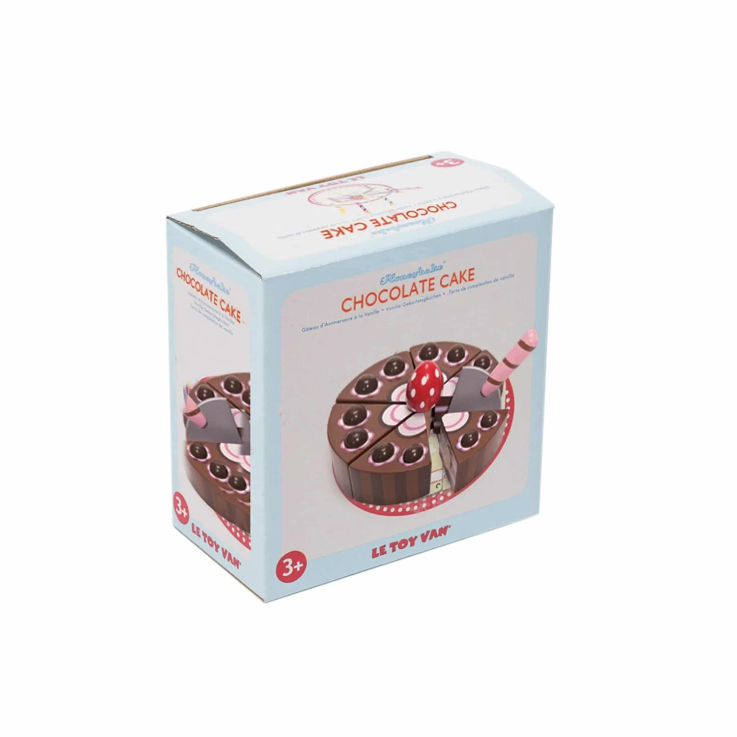 Serve up a delicious treat to little guests with this tempting Le Toy Van Chocolate Gateau Cake. This hand painted wooden cake set is finished in rich brown tones with a pretty floral motif, all topped off with a tasty looking red strawberry. Use the cake slice to cut this tasty dessert into 6 pieces using the velcro fastenings, for added realistic play.