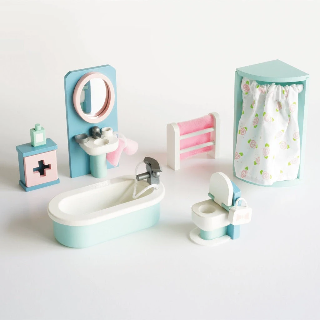 A painted wooden furniture set including a bath-tub, shower unit, loo, sink, towel rail and medicine cabinet.