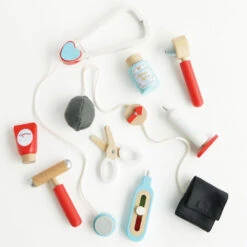 The Doctor’s Set consists of vintage style fabric medical bag with a plywood base and 9 wooden accessories. The accessories have unique features to discover, including a kaleidoscope in the ear scope, twisting syrup lid & velcro blood pressure monitor.
