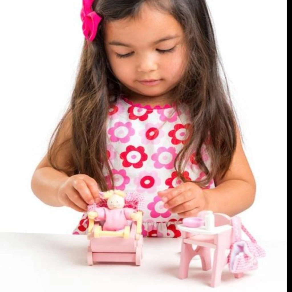 A delightful nursery set that includes a posable wooden baby, a buggy, a highchair and all accessories as pictured.