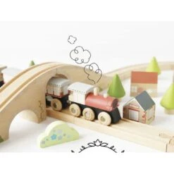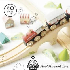 The wooden carriages are magnetic and attach together to make a longer train. Complete with highly detailed buildings, a station, houses, market, hospital and farmhouse, tents plus wooden trees and bushes for added realistic play possibilities.