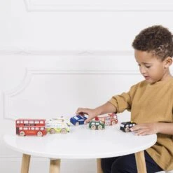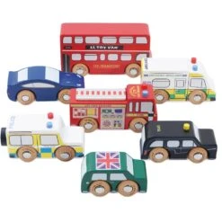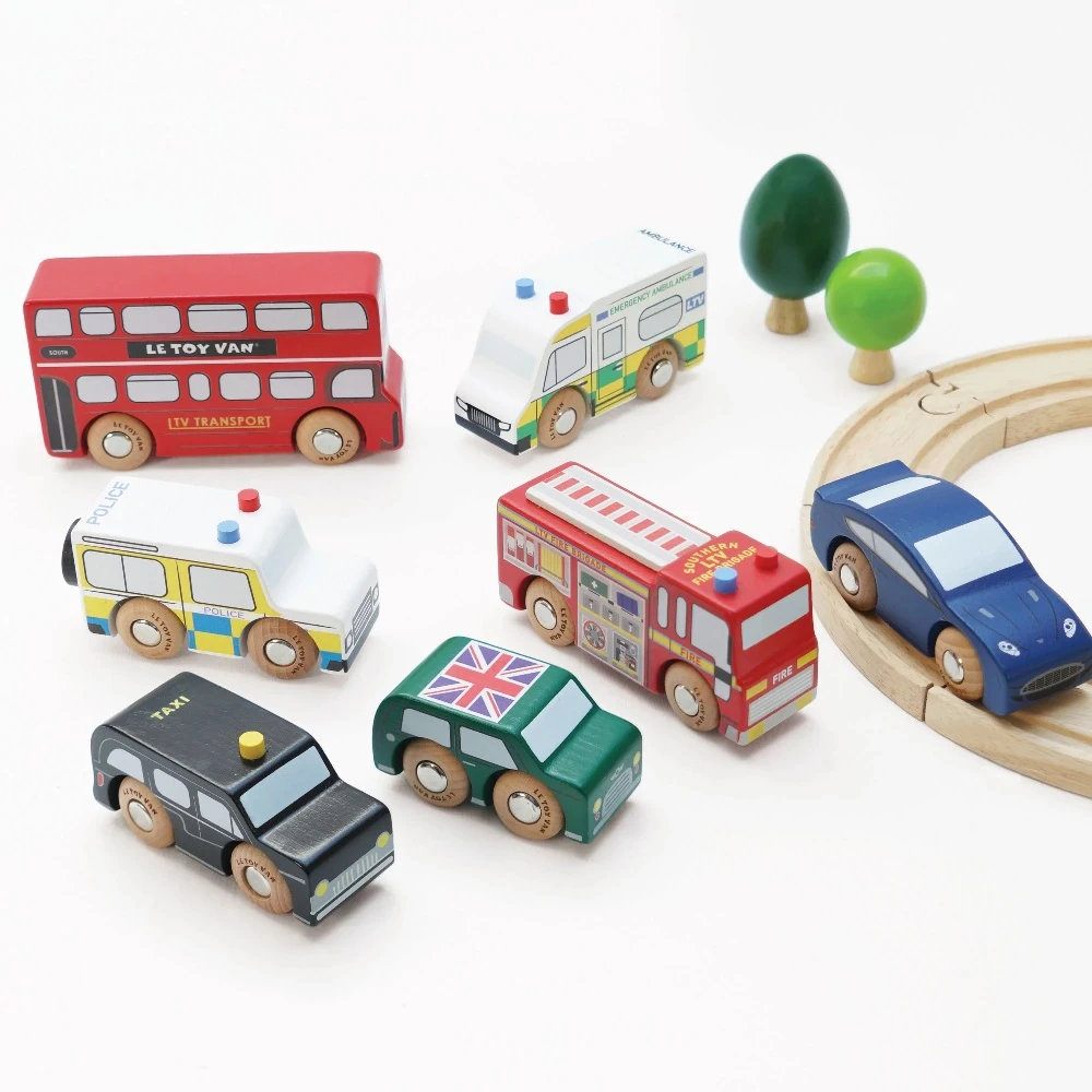 This wooden Le Toy Van London Car Set for kids includes 7 iconic London vehicles; a double decker bus, a black taxi, a fire engine, a police van, an ambulance and 2 sporty cars (compatible with wooden train tracks).