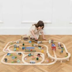 - 120 piece wooden train set featuring 2 trains, track and many accessories