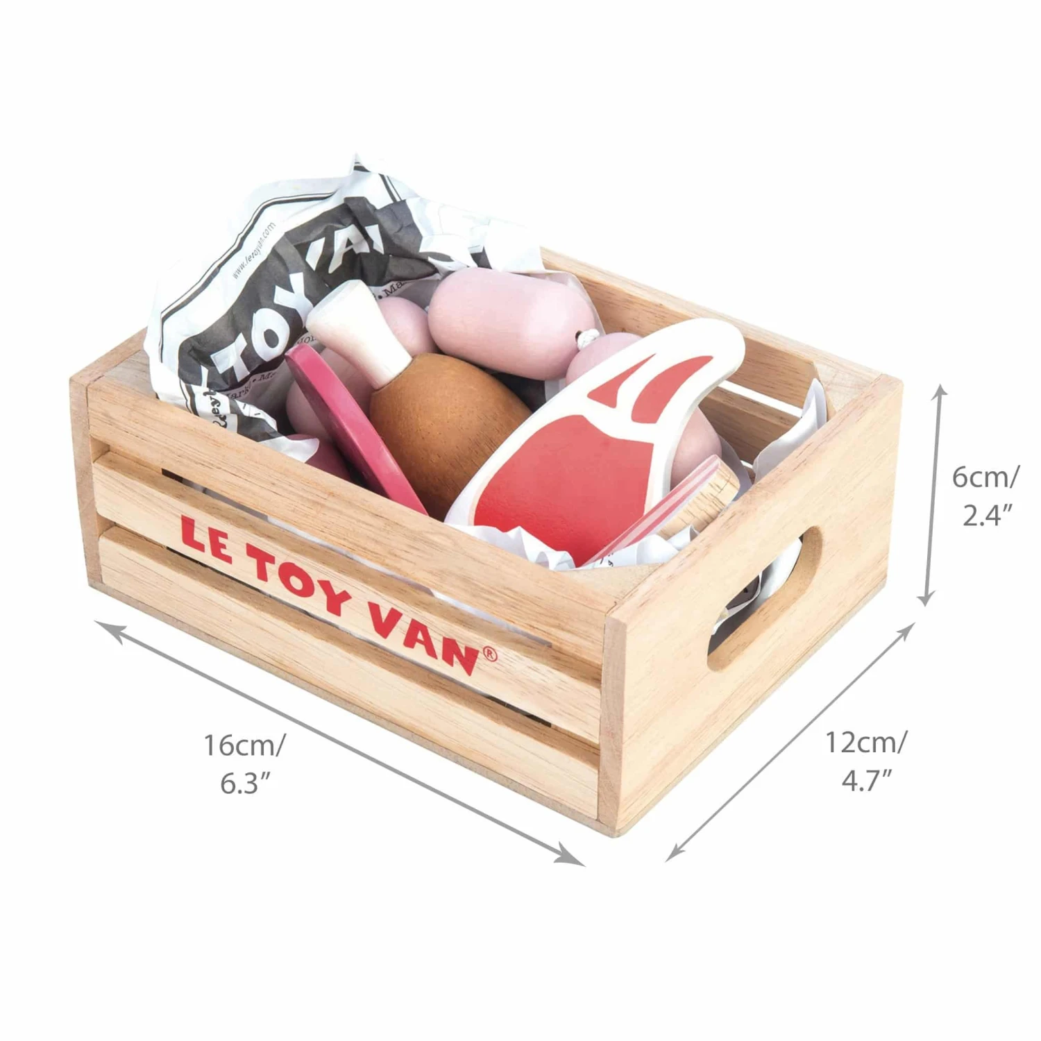 Market day fun awaits with this wonderful wooden Le Toy Van Market Meat Crate for little imaginations. This tasty meat crate complete with sausage, steak, chicken, salami & bacon pieces is perfect for pretend play activities. Teach little ones about the different food groups and healthy eating with this fantastic early learning toy.