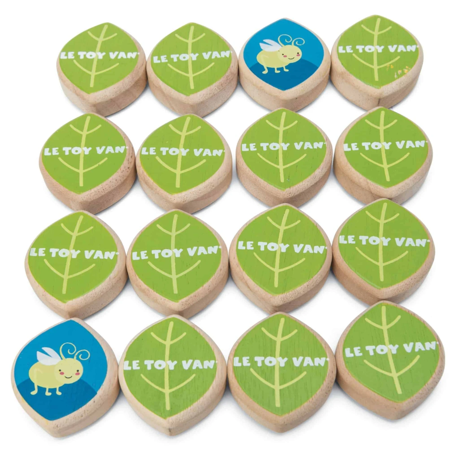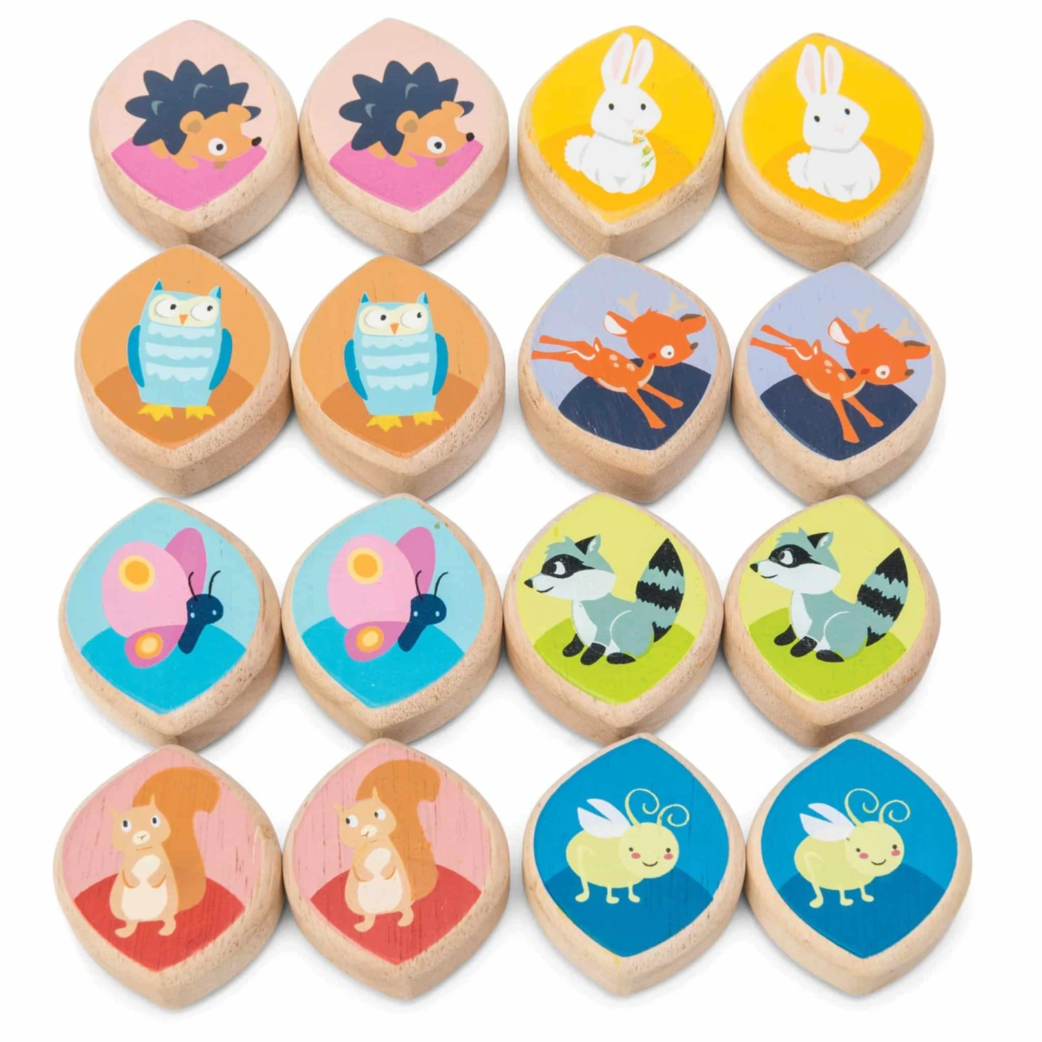 Le Toy Van Memory Game is a solid rubberwood game packaged in a gift box. Complete with, 8 pairs of animal wooden leaves and a high quality printed fabric bag. The memory game encourages social play developing speech and recognition skills.