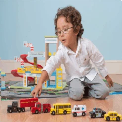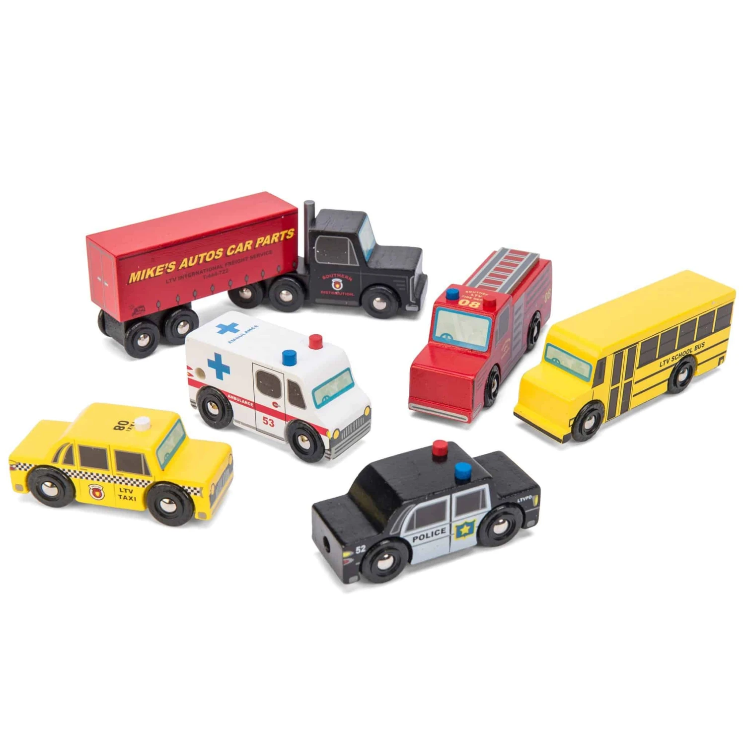 Comprising a 10-wheeler articulated truck, a school bus, a police car, a yellow taxi, an ambulance and a fire truck. Compatible with our exciting range of wooden trains sets and other standard train sets.