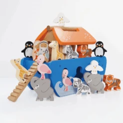 - Noah’s Ark themed wooden shape sorter, complete with animals and figures