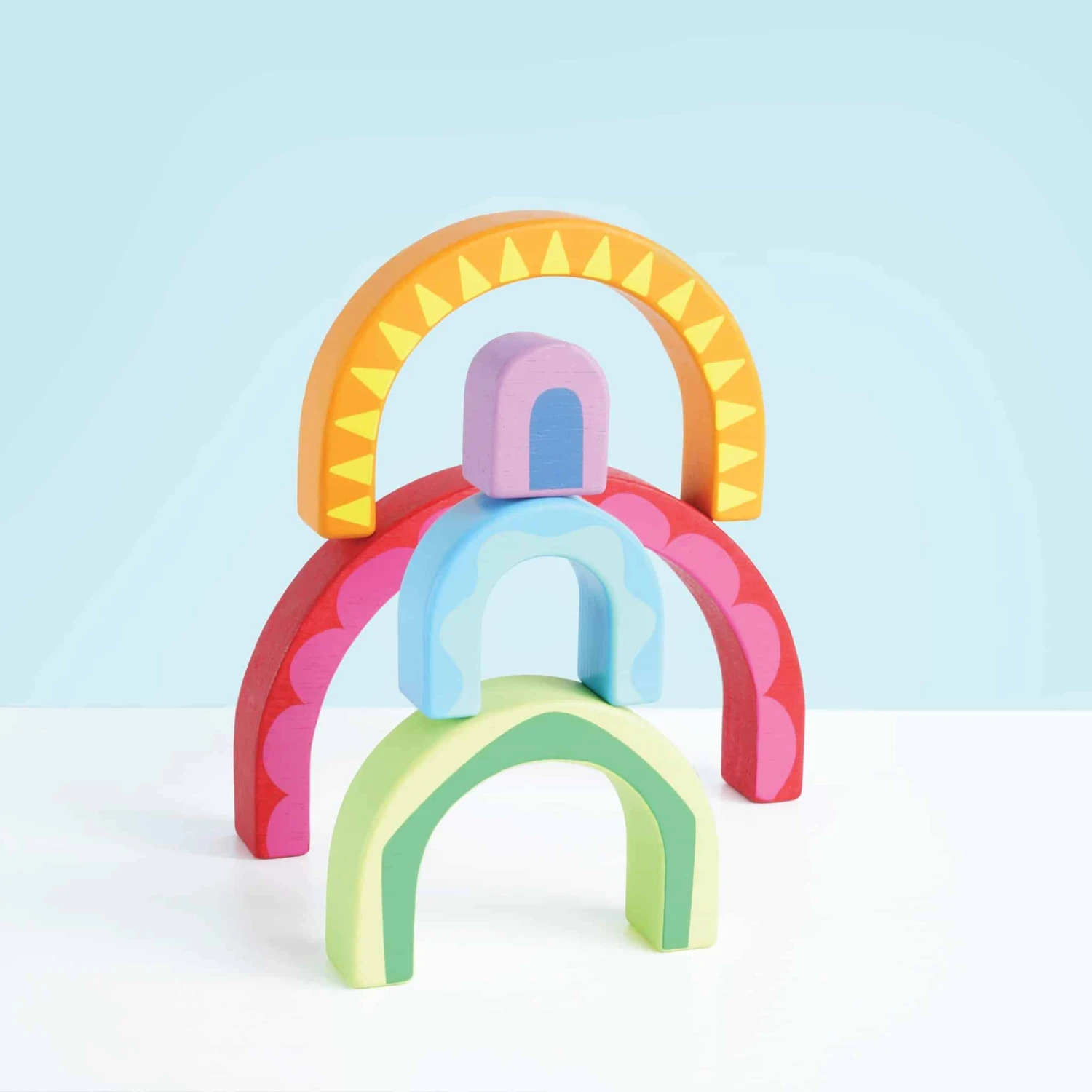 This cheerful Le Toy Van Rainbow Tunnel Stacker in pretty primary colours makes a great toy to inspire open ended, Montessori inspired play. Designed by our skilled toy makers and crafted from solid rubberwood, this toy is designed for endless creative play, for wherever little imaginations take them.