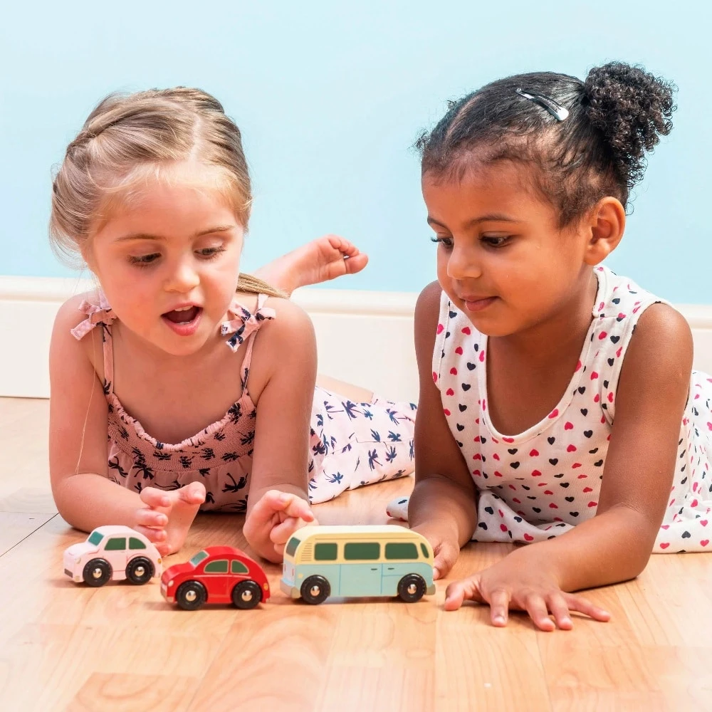Painted in soft pastel shades, this eye catching set features two retro style cars and a camper van and is sure to inspire may hours of interactve play. Scaled to fit our wonderful range of Le Toy Van garages and playmats (train track compatible). An award winning toy would make a charming gift or stocking filler surprise.