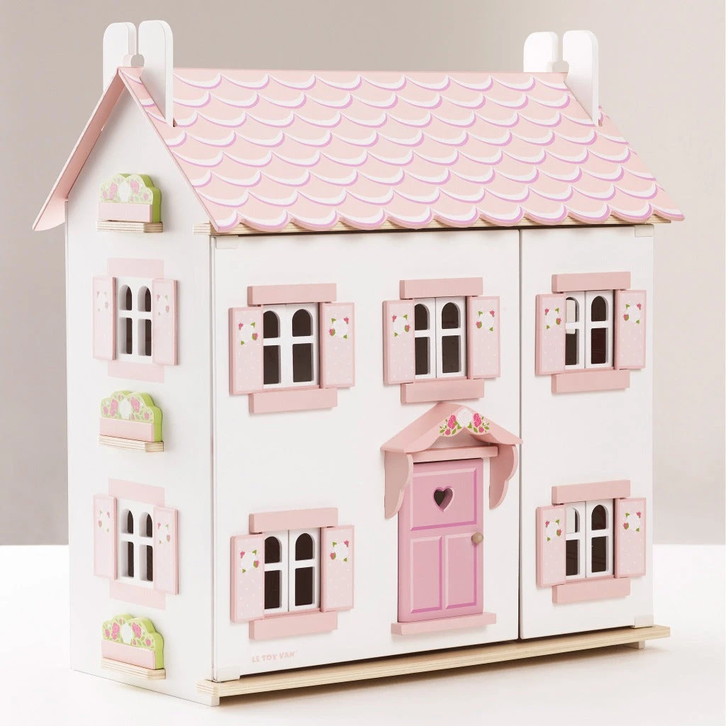 Full of nostalgic charm, this wonderful doll house is painted in the prettiest pastel pink and fresh whites, with opening and closing windows and shutters, each featuring a floral motif. The cute front porch makes a welcoming entrance for little guests.