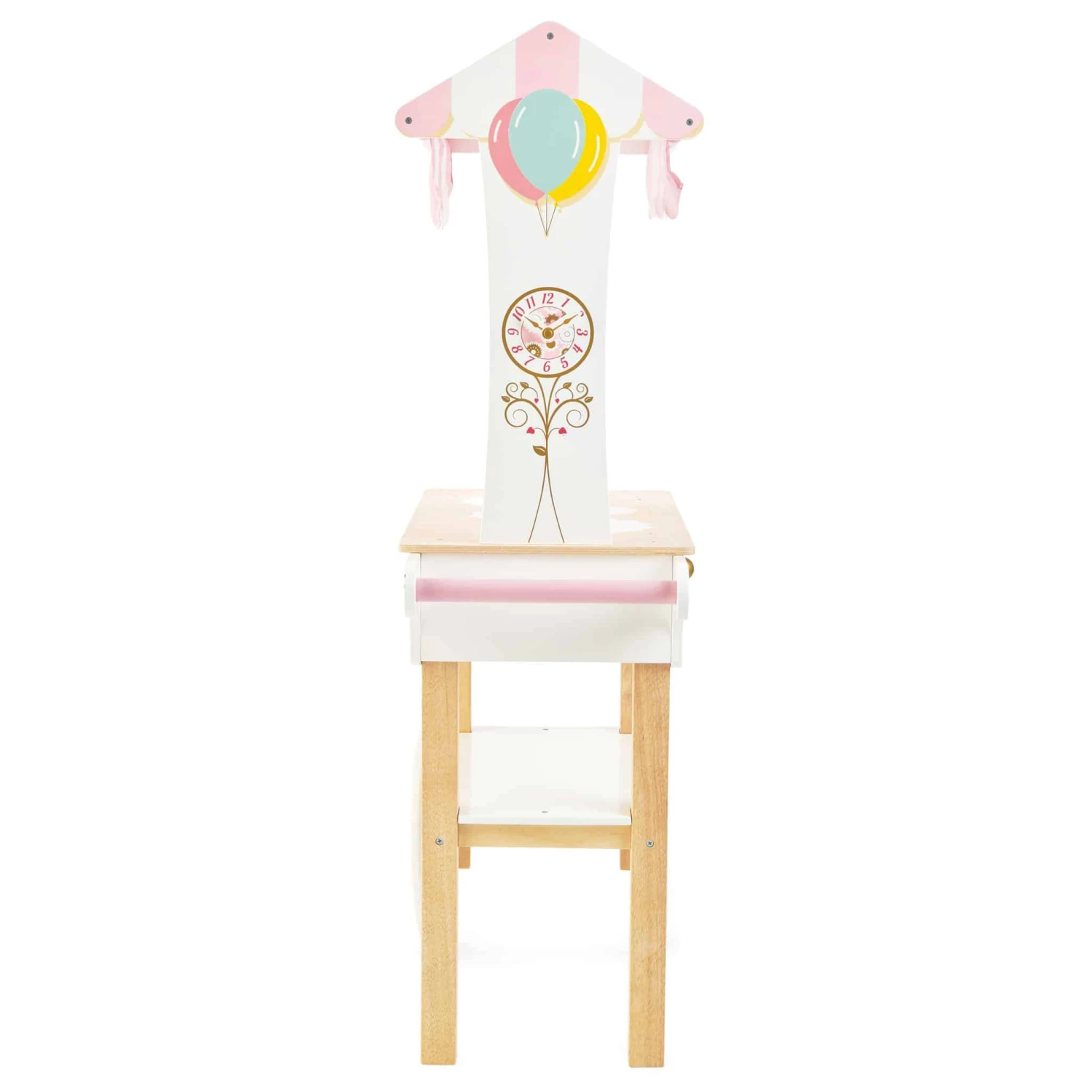 The traditional candy striped fabric canopy really sets off this beautiful wooden toy. Complete with a secret drawer ,this classic trolley features two wheels and a handle for wheelie good fun. Adorned with delightful illustrations and a cake and beverage menu on both side panels. Painted in child safe, non-toxic water based stain.