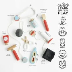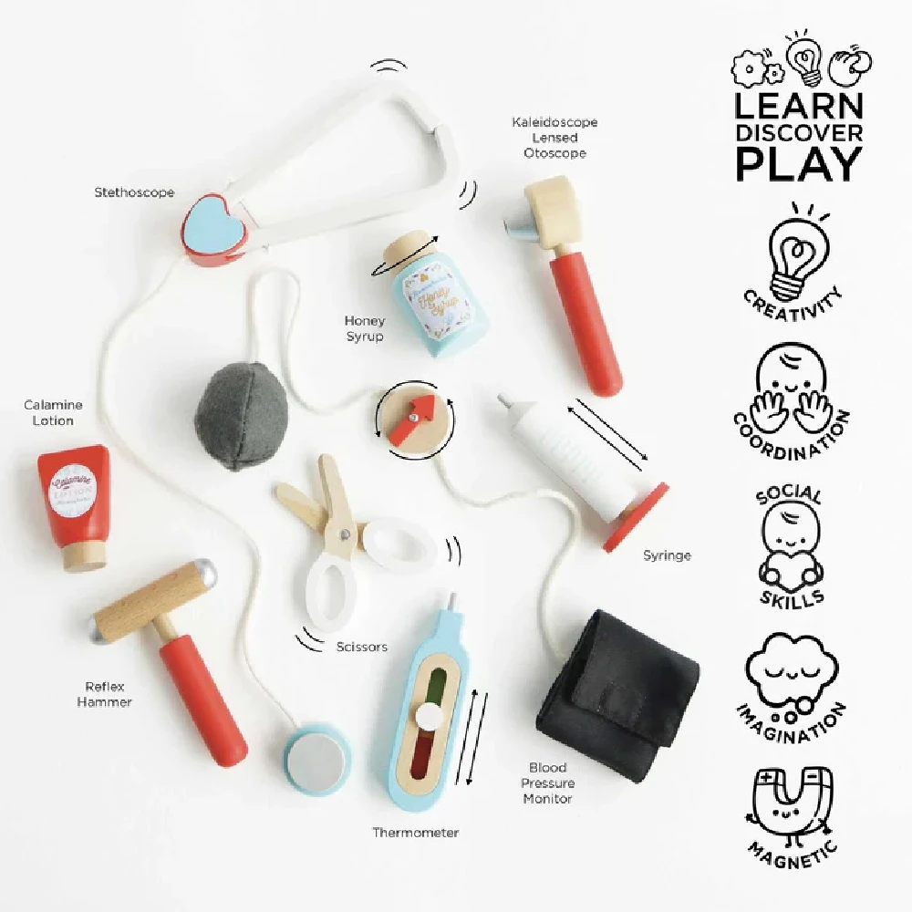 Complete with 9 colourful wooden play accessories and unique features to discover, including a stethoscope, thermometer, needle, surgical scissors, ointment and more. Role play has never been so much fun!