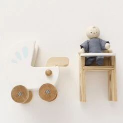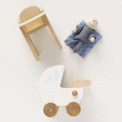 This adorable Nursery Set, from award winning FSC wooden toy company Le Toy Van, is perfect for independent play. Your little loves will enjoy creating stories and scenarios with this gorgeous wooden character. The little baby has been given a soft hand-finished fabric outfit and is fully posable. Including a buggy, high chair and other accessories, this lovely character set has been sized to fit into the Le Toy Van dolls houses. For extra fun, why not pair this with other figures to complete the family and see where your little one’s imagination takes them!Â