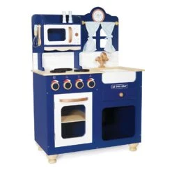 Something smells delicious! What’s cooking in the Le Toy Van FSC Wooden Oxford Toy Kitchen? This beautiful kitchen will have your little one entertained for hours. With its opening doors, turning knobs and even a clock with moving hands there are so many new things to discover. The set is even finished with kitchen utensils, so sit back and let your little chef cook up some culinary delights, you can even add a little sprinkle of salt and pepper! The realistic kitchen is finished in a gorgeous royal blue paint with touches of copper so will make a stylish addition to the playroom or bedroom. Add a set of play food for extra play value!Â