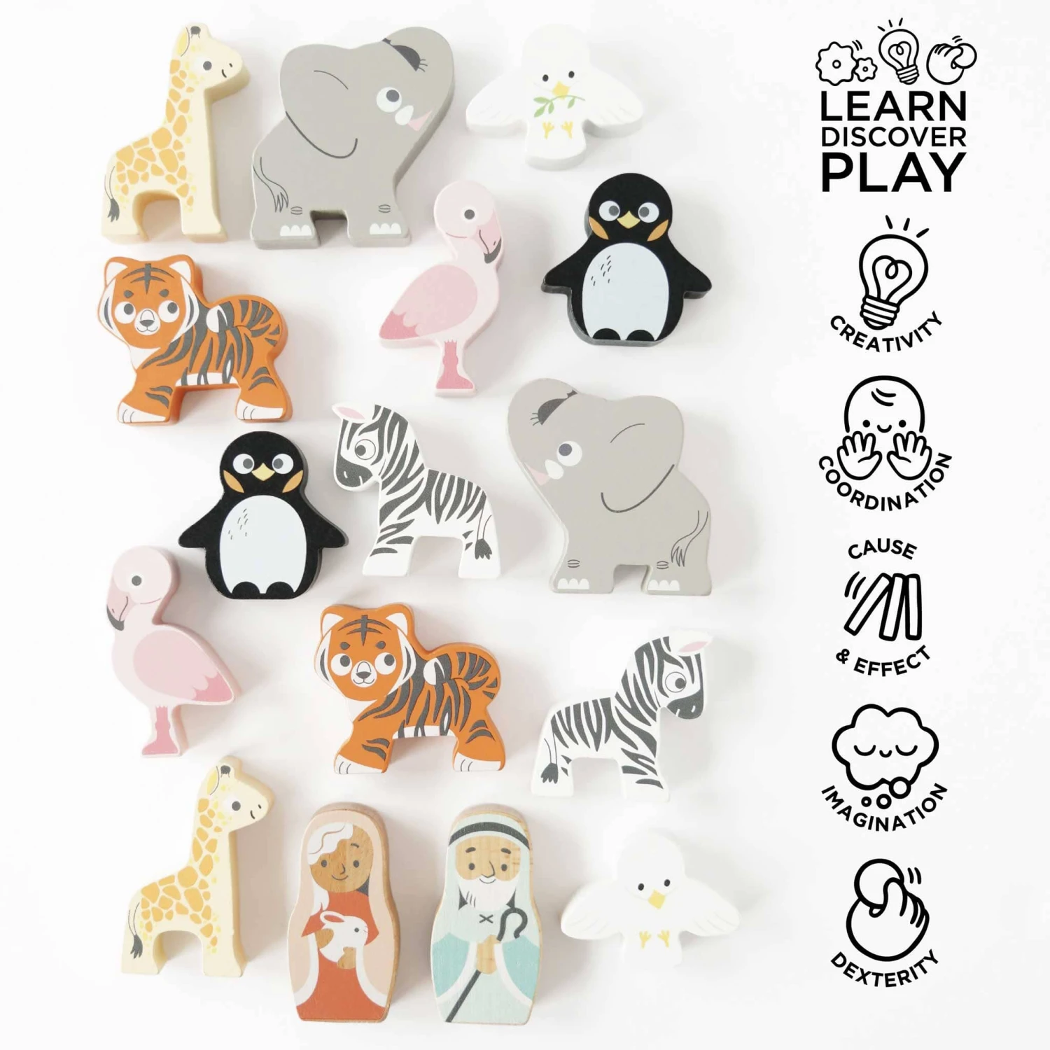This brightly painted ark is double the fun! Featuring 7 pairs of adorable wooden animal shapes plus Noah and his wife.