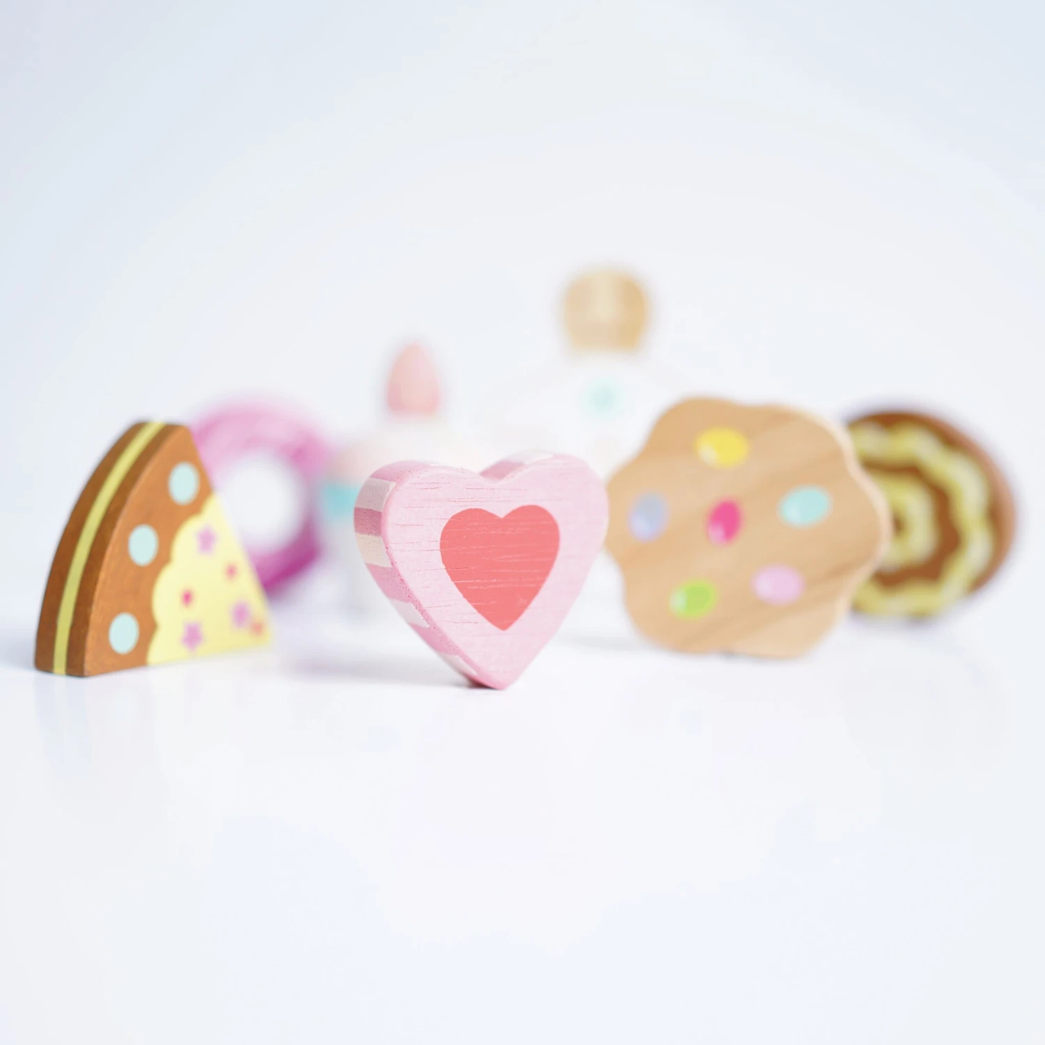Each cake play piece is crafted from solid wood with smooth kid safe edges. Decorated in pretty pastel colourways using non toxic water based paints and adorned with sprinkles and swirls. Featuring cupcake, cake slice, donut, cookie and a gingerbread man.