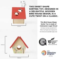 This sweet shape sorting toy, designed in a delightful wooden bird house design, is a cute twist on a classic.